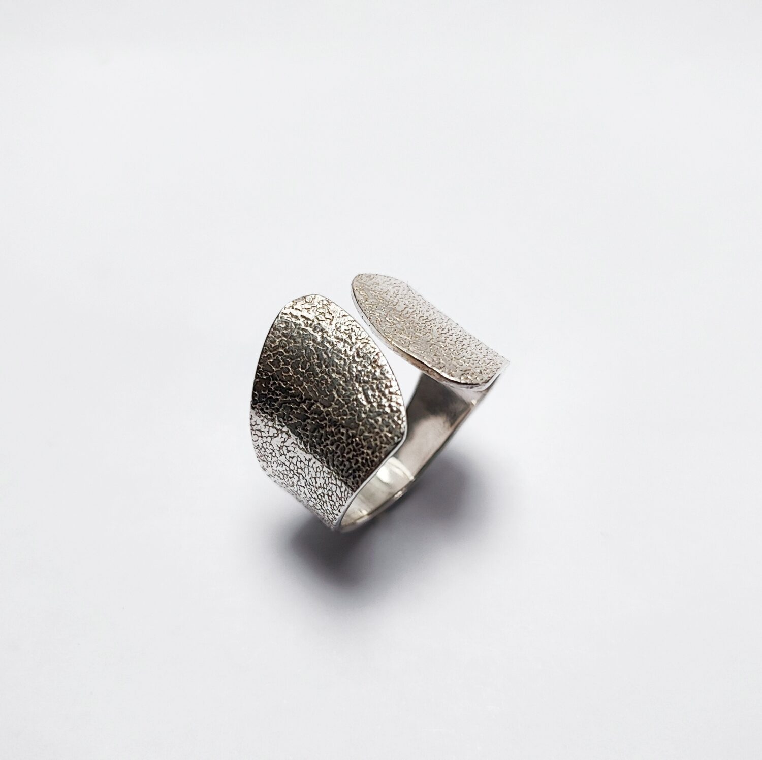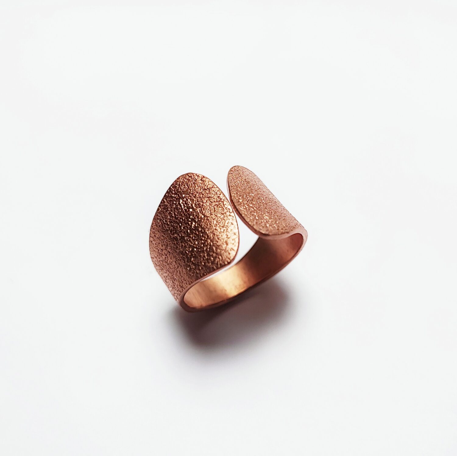 Rézgyűrű minimálisan állítható az ujjmérethez. Legszélesebb része 1,6 cm körüli. Raszteres mintázatú. Választható sárgarézből, vörösrézből, ezüst és arany bevonattal ellátva is.